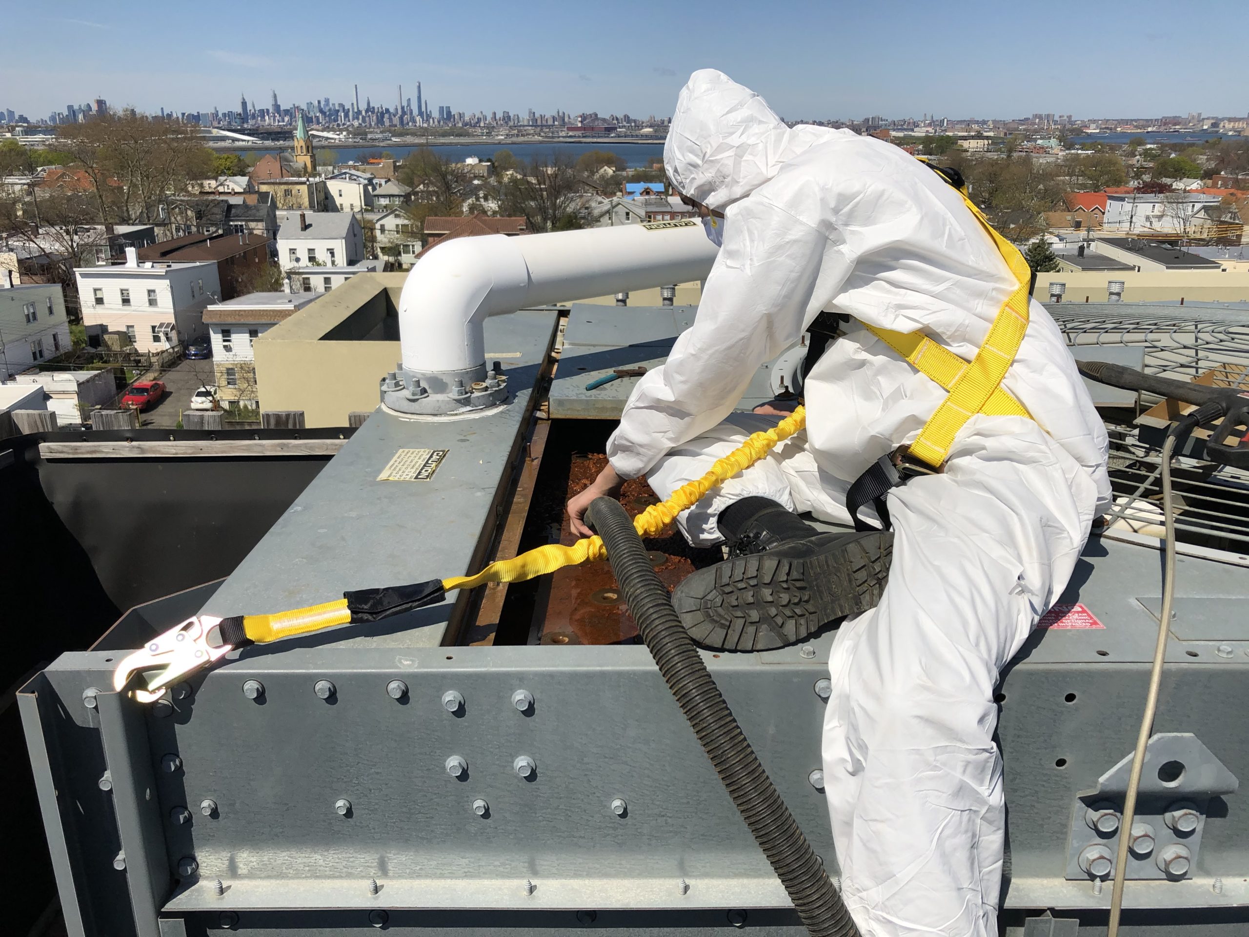 In compliance with the NYC Cooling Tower Regulations, a cooling tower must be cleaned whenever routine monitoring and inspections indicate a need for cleaning, but no less than twice a year. It is required to specify both cleaning protocol and personnel safety protective measures. To facilitate cooling tower cleaning, water contact areas such as the basin, sump, fill, spray nozzles and fittings, drift eliminators, and/or intake louvres must be properly accessed or removed.